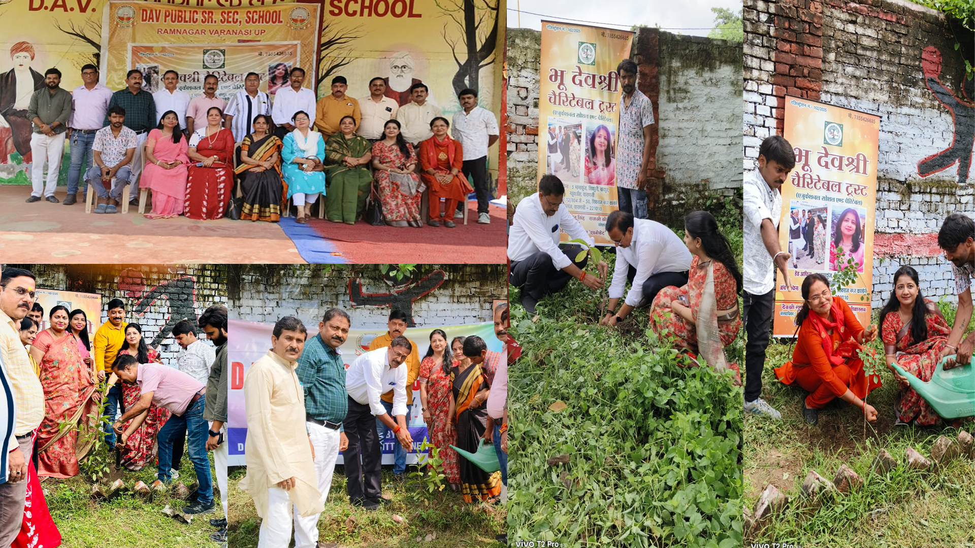 ">एक पेड़ एक जीवन विचार के तहत आज भूदेवश्री चैरिटेबल ट्रस्ट वाराणसी द्वारा ट्रस्ट की अध्यक्षा देवश्री गुप्ता की अध्यक्षता में डीएवी कॉलेज रामनगर के प्रांगण में वृक्षारोपण कार्यक्रम संपन्न हुआ। उस प्रांगण में सागवान ,आम ,जामुन, अमरुद, नीम आदि फलदार वृक्ष रोपे गए आगामी दिन टीचर्स डे के दिन छुट्टी के कारण आज ही टीचर्स डे मनाया गया। भूदेवश्री चैरिटेबल ट्रस्ट की अध्यक्षा देवश्री गुप्ता द्वारा कॉलेज की प्रधानाचार्या एकता कुमारी को अंग वस्त्र पहनाकर एवं गीता प्रदान कर सम्मानित किया गया।