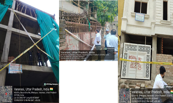 वाराणसी 25 सितम्बर 2025 को वाराणसी विकास प्राधिकरण के सचिव डॉ.वेद प्रकाश मिश्रा के द्वारा पूर्व में सील किए गए अवैध निर्माण स्थलों का स्थलीय निरीक्षण किया गया। निरीक्षण के दौरान यह पाया गया कि अनेक स्थलों पर बिना मानचित्र स्वीकृति अथवा स्वीकृत मानचित्र के विपरीत निर्माण कार्य किया गया था, जिन पर समय-समय पर प्राधिकरण द्वारा नोटिस, सीलिंग एवं एफ.आई.आर. की कार्रवाई की जा चुकी है।