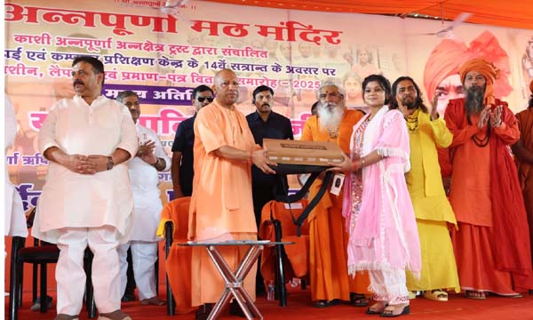 मुख्यमंत्री योगी आदित्यनाथ ने लोगो को संबोधित करते हुए कार्यक्रम के भव्य आयोजन हेतु अन्नपुर्णा आश्रम के महंत शंकर पुरी को धन्यवाद दिया। उन्होंने कहा कि मां अन्नपूर्णा जी की धरा पर 108 वर्षों से संचालित इस आश्रम जिसमें अनेक लोककारी कार्य किए जा रहे हैं, उसके लिए महंत शंकर पुरी व पूरी टीम को बधाई दिया। उन्होंने सभी छात्र छात्राओं, बेटियों, बहनों को भी इस प्रकार के प्रशिक्षण के लिए बधाई दिया। उन्होंने कहा कि मां जगत जननी के पूजा अर्चन के बाद आज शरद पूर्णिमा के अवसर पर हम सभी मां अन्नपूर्णा जी के इस पुण्य कार्यक्रम में उपस्थित हैं। मुख्यमंत्री ने कहा कि प्रदेश में संचालित मिशन शक्ति कार्यक्रम में ये कार्यक्रम जुड़कर नारियों के स्वावलंबन के प्रति श्रद्धा और सम्मान का भाव प्रस्तुत करता है। मां अन्नपूर्णा के प्रसाद स्वरूप ही हम अन्न को प्राप्त कर पाते हैं। उन्होंने कहा कि हम सभी का सौभाग्य है कि काशी का नेतृत्व दुनिया के सबसे लोकप्रिय नेता प्रधानमंत्री द्वारा किया जा रहा है। उन्होंने विशेष रूप से जोर देते हुए कहा कि प्रधानमंत्री के नारियों के उत्थान हेतु ही बेटी बचाओ बेटी पढ़ाओ, प्रदेश में 60 लाख महिलाओं को आवास प्रदान करना, 12 करोड़ से ज्यादे लोगों को शौचालय मुहैय्या कराना, 10 करोड़ से ज्यादे लोगों को गैस कनेक्शन देना, 3 करोड़ लोगों को घरौनी मुहैया कराकर महिलाओं के उत्थान हेतु अनेकानेक कार्य किए जा रहे हैं। स्वास्थ्य, शिक्षा, स्किल मिशन के माध्यम से सरकार लगातार महिलाओं को स्वावलंबी बनाकर उनका उत्थान कर रही है। उन्होंने बताया कि दुनिया में कृषि के बाद सबसे अधिक लोगों को रोजगार वस्त्र सेक्टर देता है। उन्होंने महिलाओं से कहा कि आप जितनी सिलाई करेंगी, आपकी आय में उतनी अधिक वृद्धि होगी। उन्होंने प्रदेश में संचालित वन डिस्ट्रिक्ट वन प्रोडक्ट का उदाहरण भी दिया तथा कहा कि महियायें यहां कपड़ा जो तैयार करेंगी उसको पूरे विश्व की महिलाएं पहनेंगी। प्रदेश की राजधानी में 1100 एकड़ में वस्त्र मित्र पार्क बन रहा। प्रदेश के अनेकों जगहों पर टेक्सटाइल पार्क बनाया जा रहा है, जो आने वाले समय में वस्त्र रोजगार के लिए वरदान साबित होगा। यह मठ देव वाणी संस्कृत के लिए भी लगातार कार्य कर रहा है। अन्नपूर्णा मंदिर के संस्कृत महाविद्यालय के बच्चे सभी कार्यक्रमों में वैदिक मंत्रोच्चार करके माहौल को आध्यात्मिक बना देते हैं। यहां गौसेवा भी बहुत अच्छे से की जा रही है। भारत की यही संस्कृति रही जिस पद्धति को ये मठ बहुत तेजी से आगे बढ़ा रहे है। यहां छात्रों को संस्कृत परम्परा के साथ जुड़कर आधुनिक शिक्षा दी जा रही है। आने वाले समय में दुनिया को जोड़ने वाली भाषा संस्कृत ही होगी। संस्कृत के उत्थान हेतु सरकार 