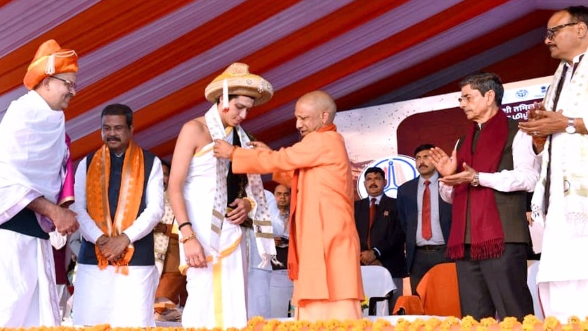उत्तर प्रदेश के मुख्यमंत्री योगी आदित्यनाथ ने मंगलवार को नमो घाट पर आयोजित काशी तमिल संगमम कार्यक्रम के शुभारंभ के मौके पर 19 वर्षीय वेदमूर्ति देवव्रत महेश रेखे को स्मृति चिन्ह देकर उनका सम्मान किया।