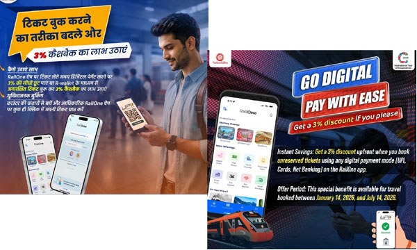 लखनऊ। रेल यात्रियों को डिजिटल माध्यम से टिकट बुकिंग के लिए प्रोत्साहित करने के उद्देश्य से रेलवे ने बड़ा फैसला लिया है। Rail One ऐप के जरिए अब अनारक्षित टिकट बुकिंग पर यात्रियों को 3 प्रतिशत की छूट का लाभ मिलेगा।